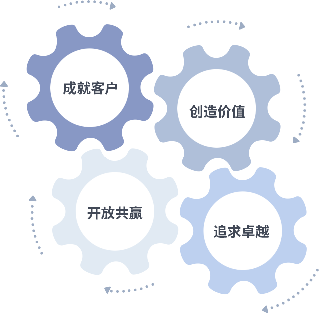 成就客户是一切决策的出发点,,,,创造价值是衡量所有工作的标准,,追求卓越是我们做事做人的态度,,,,开放共赢是我们的格局也是最终的结果。。价值观的齿轮环环相扣,,,,推动着组织里的每个人不断向前。。。。